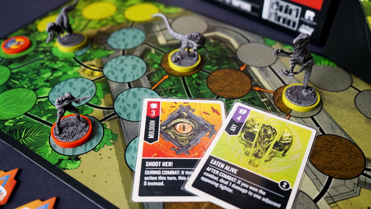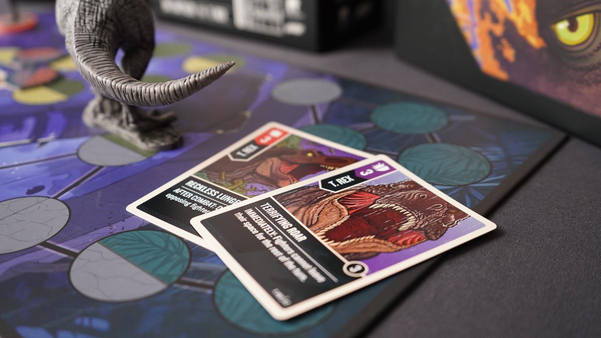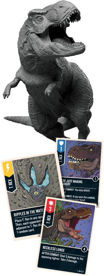 Однако невероятные размеры имеют и свои минусы: двигается Ти-рекс очень неторопливо, всего на 1 ячейку за ход. Правда, имеет несколько приёмов, которые позволят ей совершить мощный рывок к добыче. Но самое опасное в игре за Ти-рекса — расход карт. Ведь в конце каждого хода это чудовище добирает по одной карте, почти все атаки можно усилить, а низкая скорость перемещения намекает, что усиливать манёвры — тоже неплохая идея. Только вот помните, что если закончатся карты, ваш герой будет получать урон с каждым ходом. Так что иногда спешить всё же не стоит.