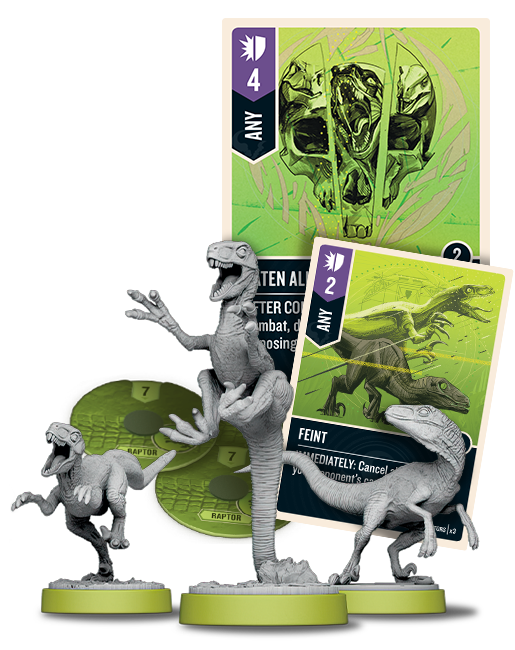 Уникальный «тройственный» герой — все рапторы считаются героями, каждый обладает своей фигуркой и собственным диском жизней. А в стае они втройне опасны, ведь любая их атака получает +1 за каждого другого раптора рядом с жертвой.