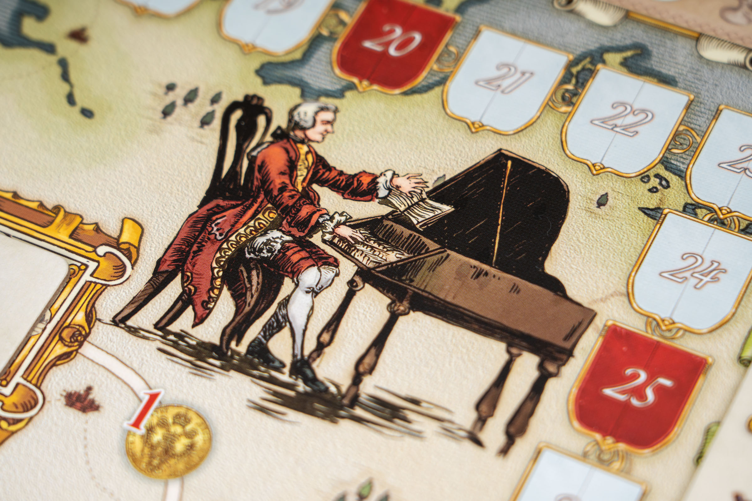 Каждое ваше действие тематично, а оформление и сам игровой процесс содержат отсылки к реальным фактам из биографии Моцарта. Например, пять раундов соответствуют творческим периодам его жизни, «Реквием» дописывают реальные композиторы того времени, а жетон первого игрока выполнен в виде камертона. При этом тематика игры не давит на вас, а остаётся всегда где-то рядом, сопровождая как приятная лёгкая мелодия.