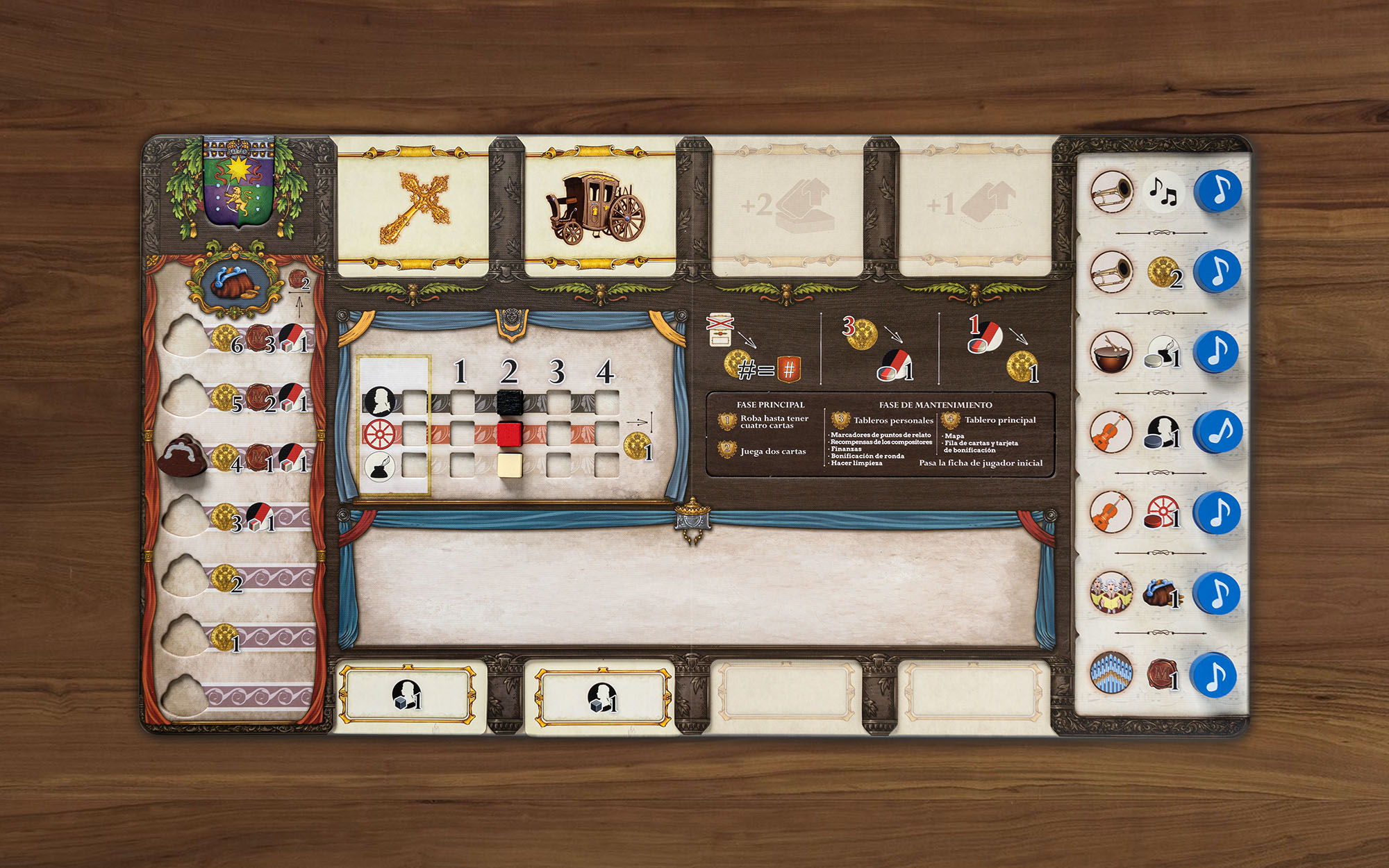 Фаза подготовки наступает после того, как все игроки выполнят по четыре хода, разыграв таким образом восемь карт из своей колоды. Теперь все маркеры на шкале очков истории обнуляются, а потом выставляются на значения в соответствии с картами в области истории вашего планшета. Также вы получаете награды от композиторов, прибыль и бонусы периода. Наконец, обновляются карты исполненных опусов и личная колода, рынок карт, жетоны городов и королевских дворов на поле.