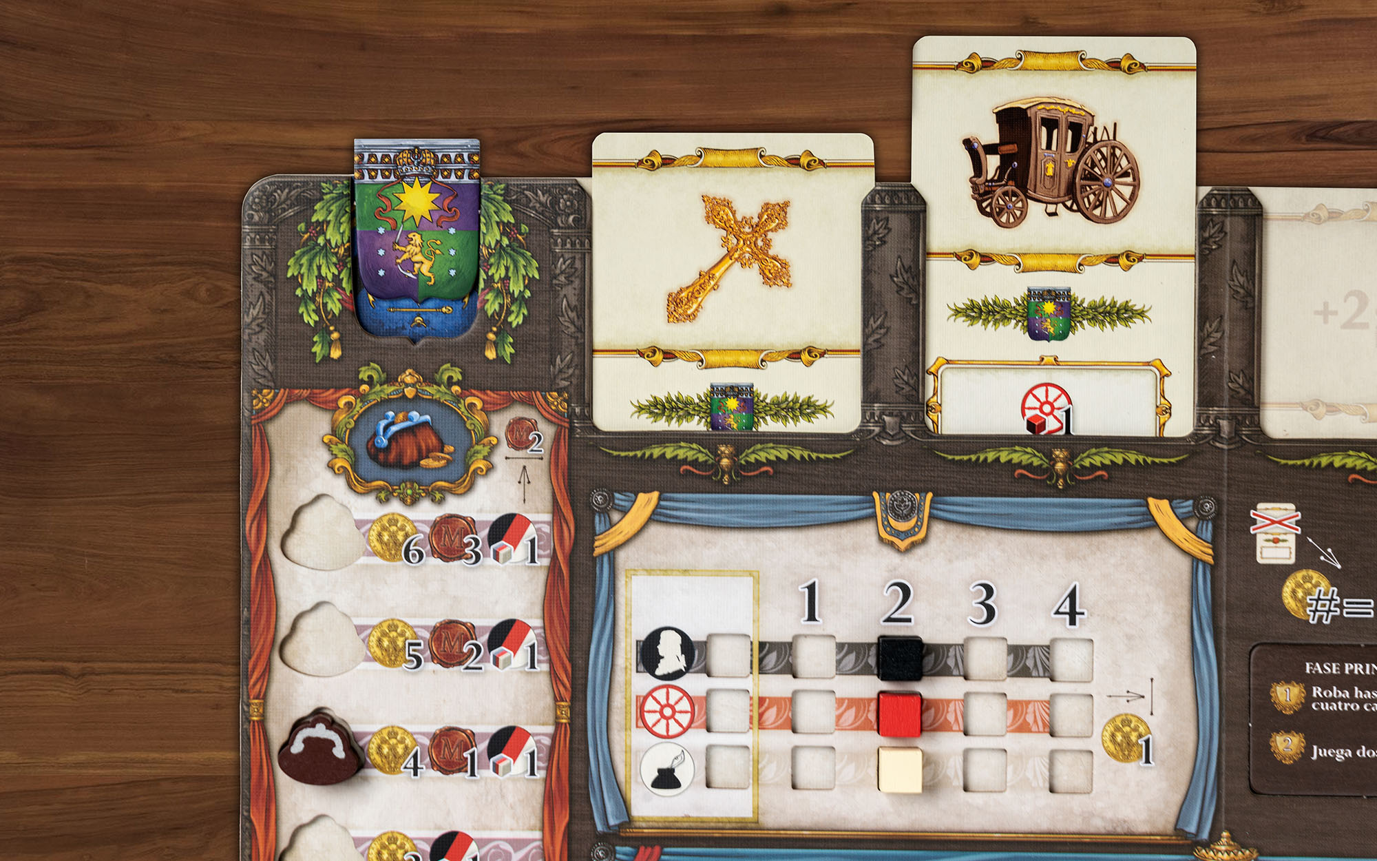 Другую карту следует поместить в ячейку в нижней части планшета прямо под картой событий. Она даст вам очки истории в следующем раунде — это ресурсы, которыми вы расплачиваетесь за действия в игре.