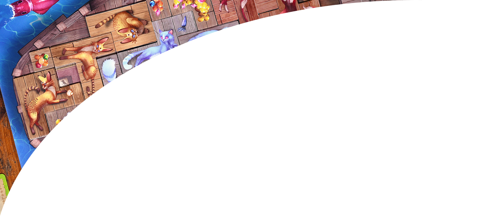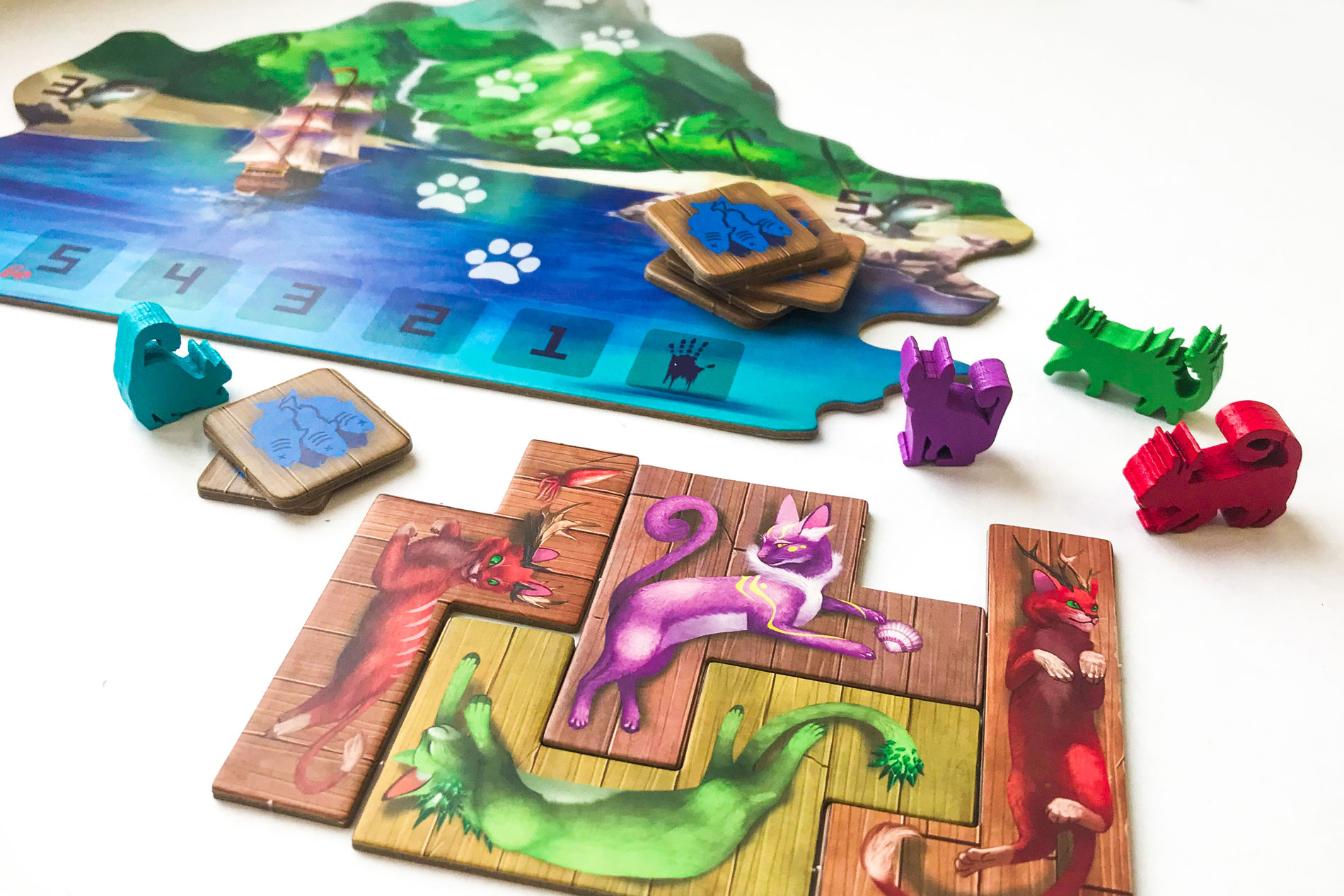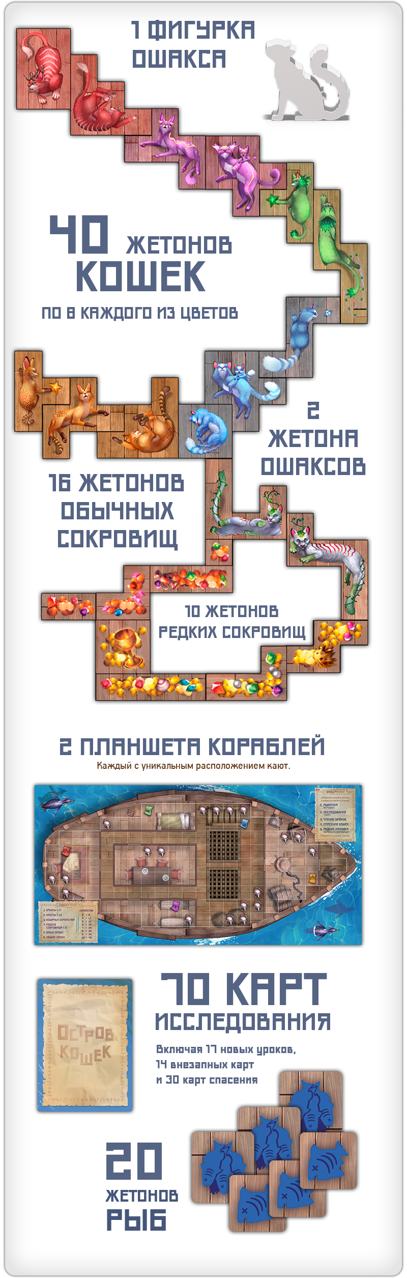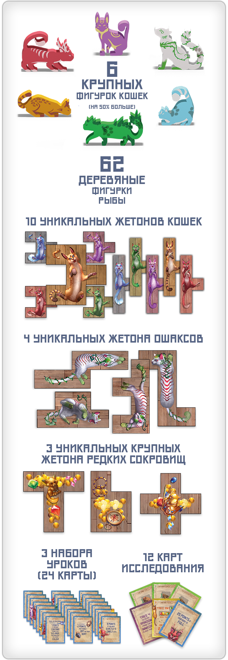 Новые карты, жетоны, а также косметические элементы — 6 крупных деревянных фигурок кошек для счётчика раундов и 62 деревянные фигурки рыбок на замену картонным из базовой игры.