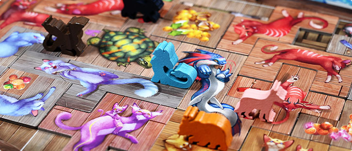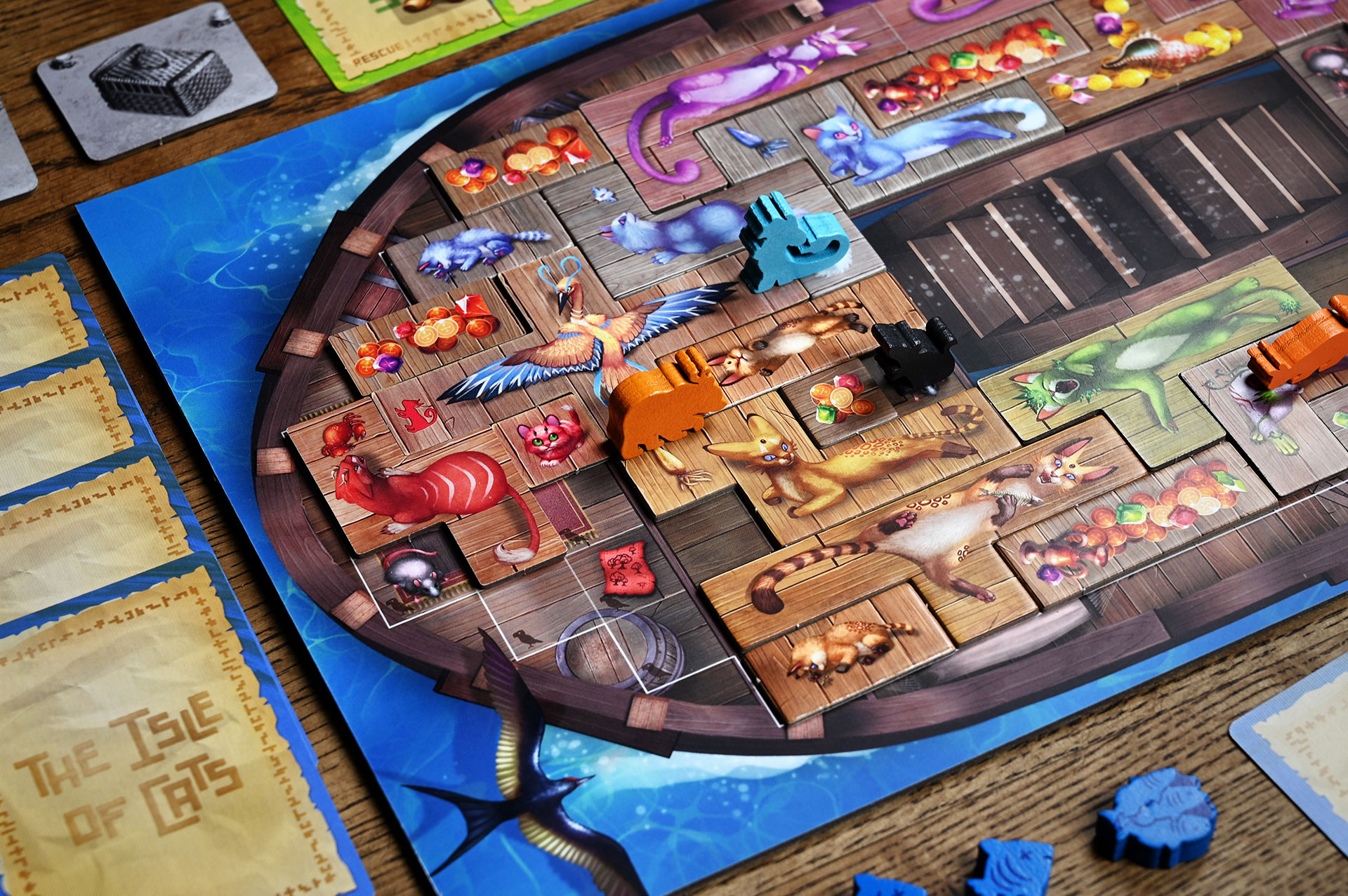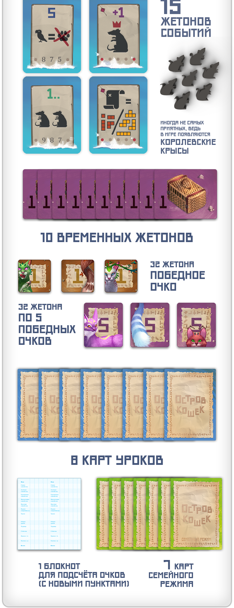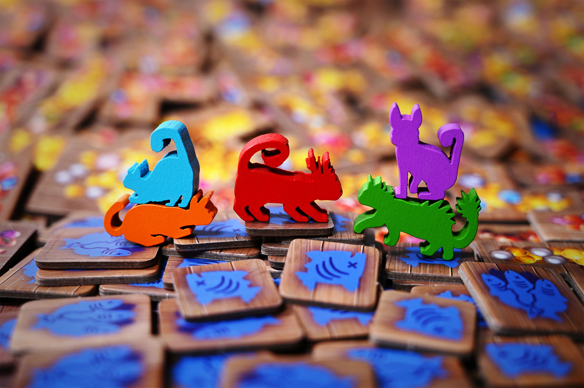 Новые карты, жетоны, а также косметические элементы — 6 крупных деревянных фигурок кошек для счётчика раундов и 62 деревянные фигурки рыбок на замену картонным из базовой игры.