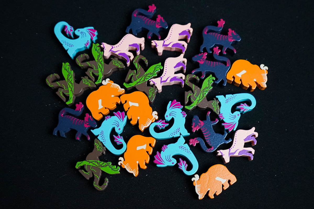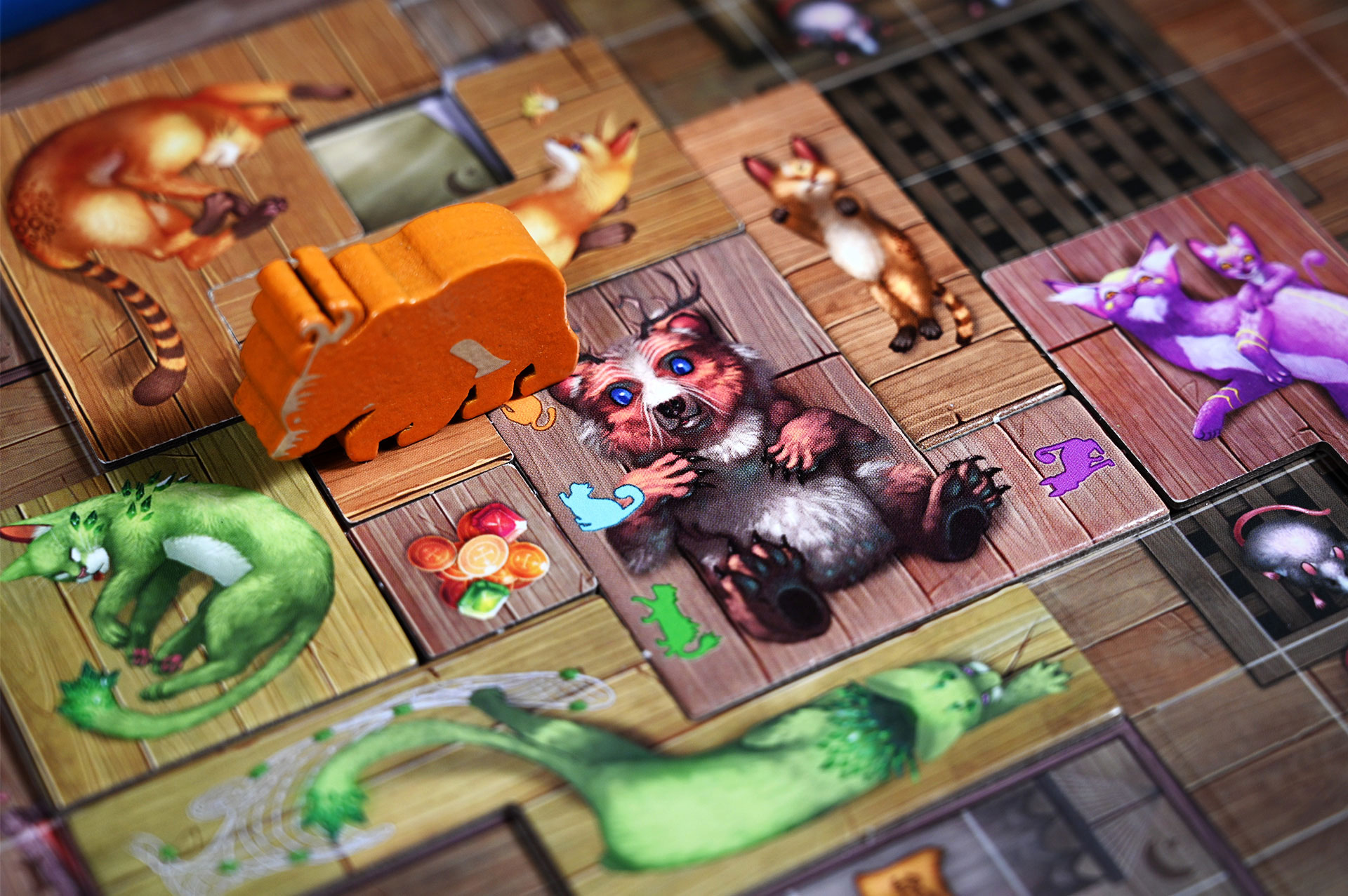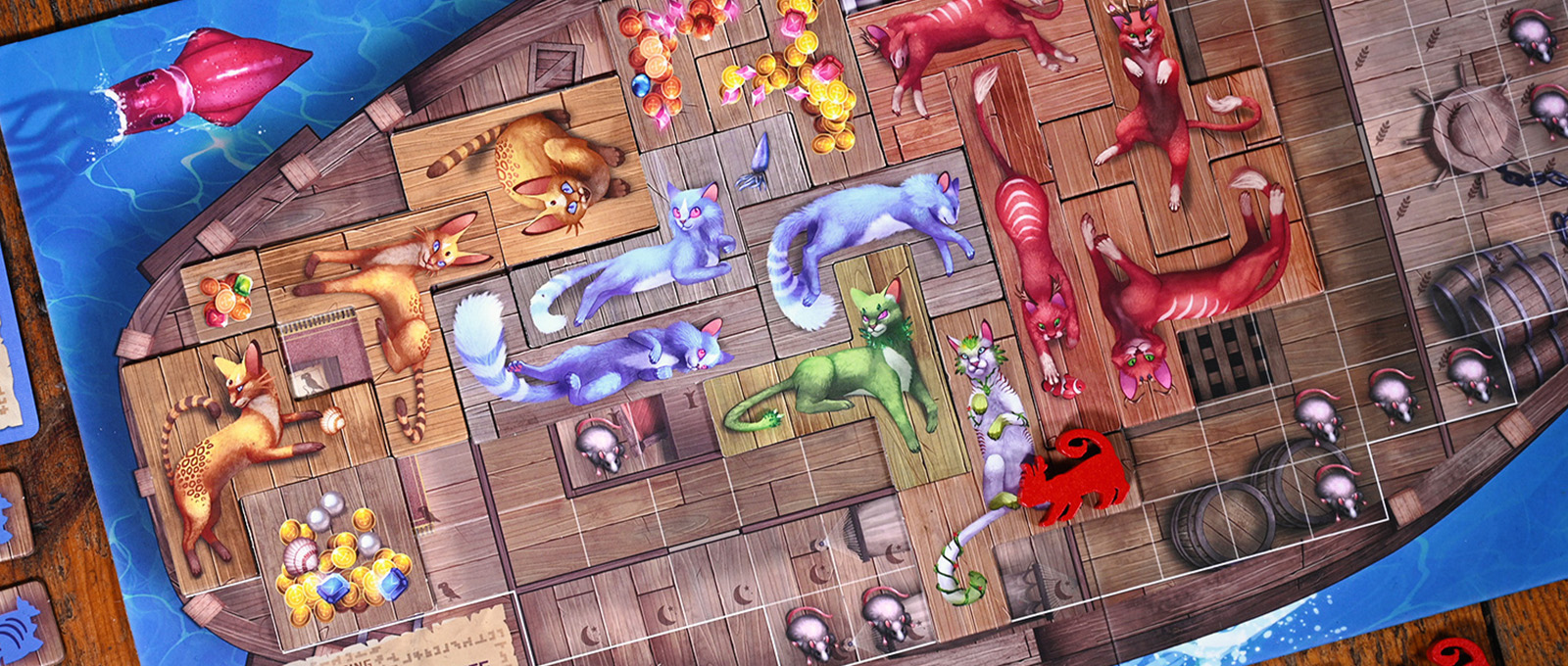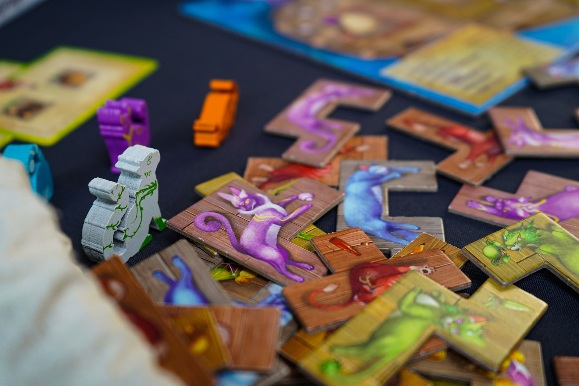 Новые карты, жетоны, а также косметические элементы — 6 крупных деревянных фигурок кошек для счётчика раундов и 62 деревянные фигурки рыбок на замену картонным из базовой игры.
