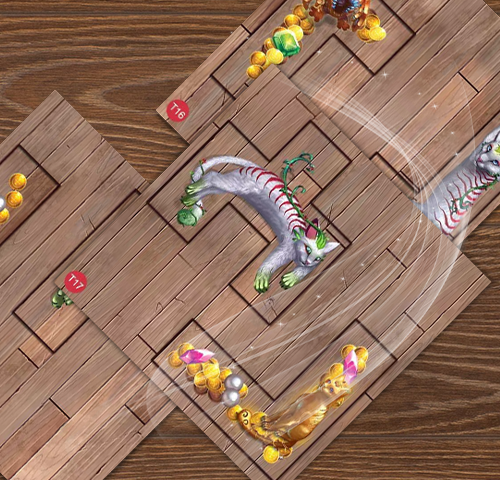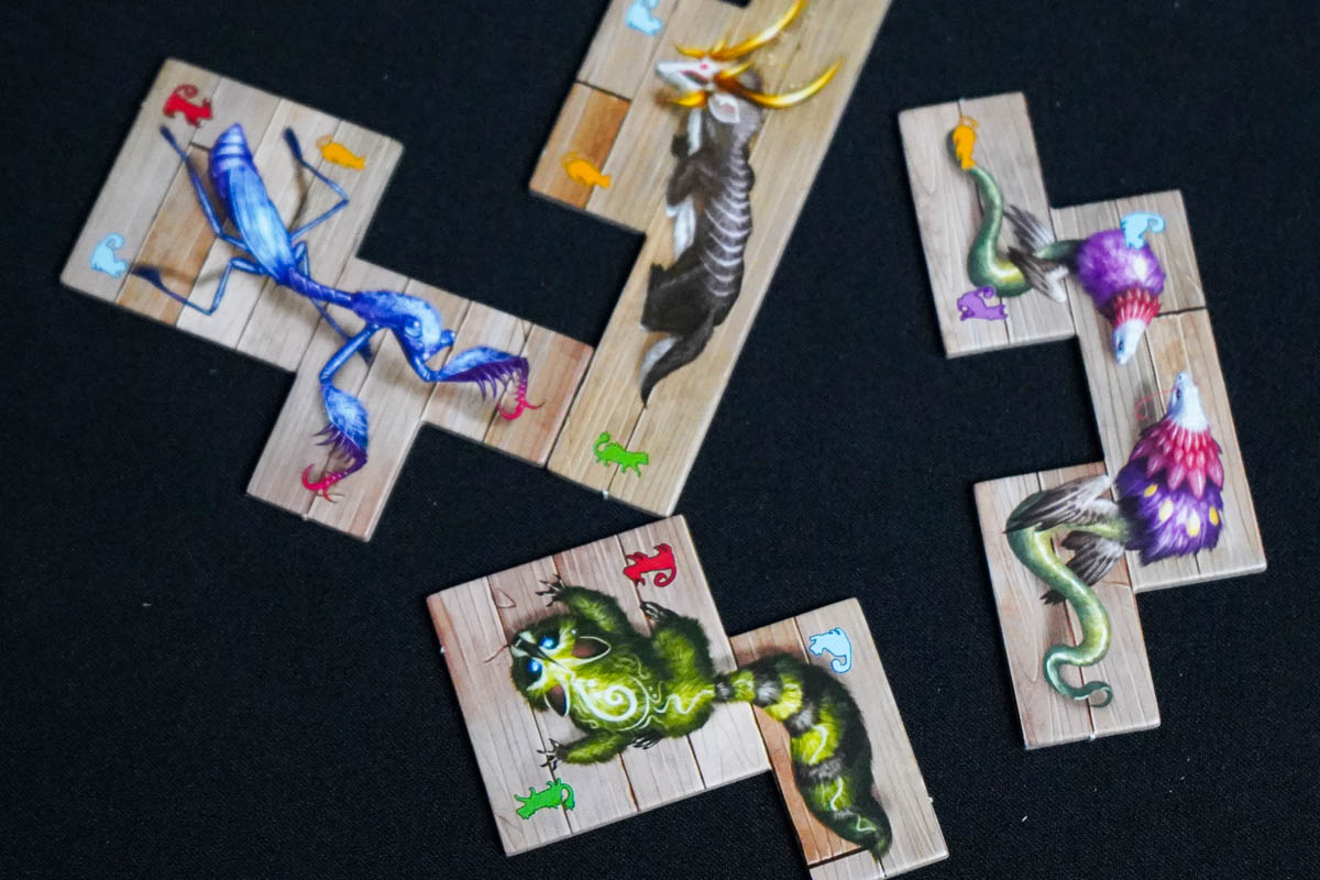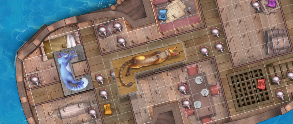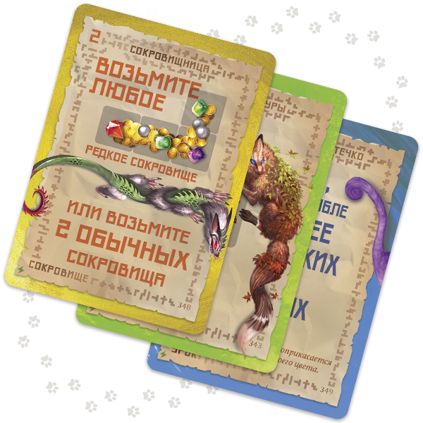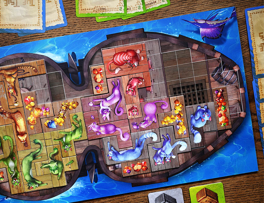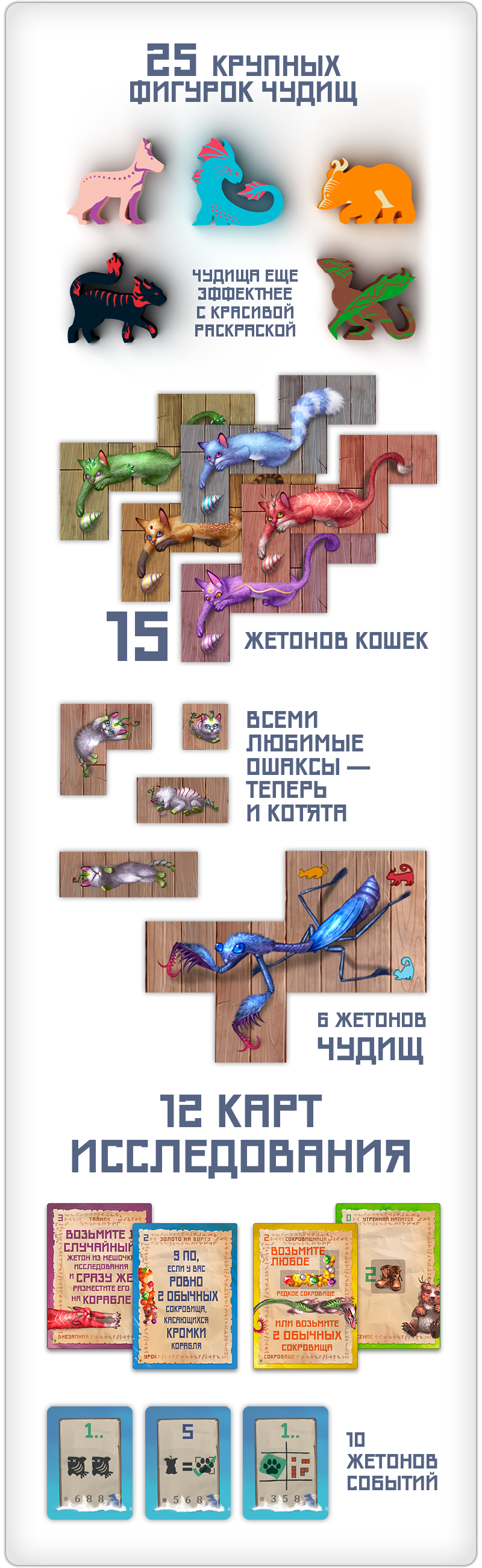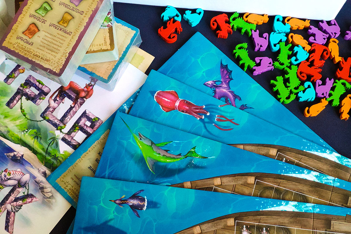 Чудища — модуль посложнее. Эти древние существа столетия жили в мире с кошками и не слишком доверяют людям, так что на корабль готовы идти только вместе с пушистыми друзьями. Заполучить себе чудище можно только в первом раунде, подманив его связкой из пяти рыбок. Разместите его на своём планшете по обычным правилам — и присмотритесь: на каждом чудище есть 3-4 символа кошек, с которыми оно особенно хочет дружить. Чтобы получить очки, вы должны поселить рядом с чудищем семейство кошек соответствующего цвета.