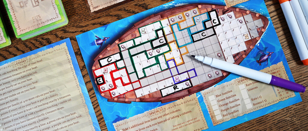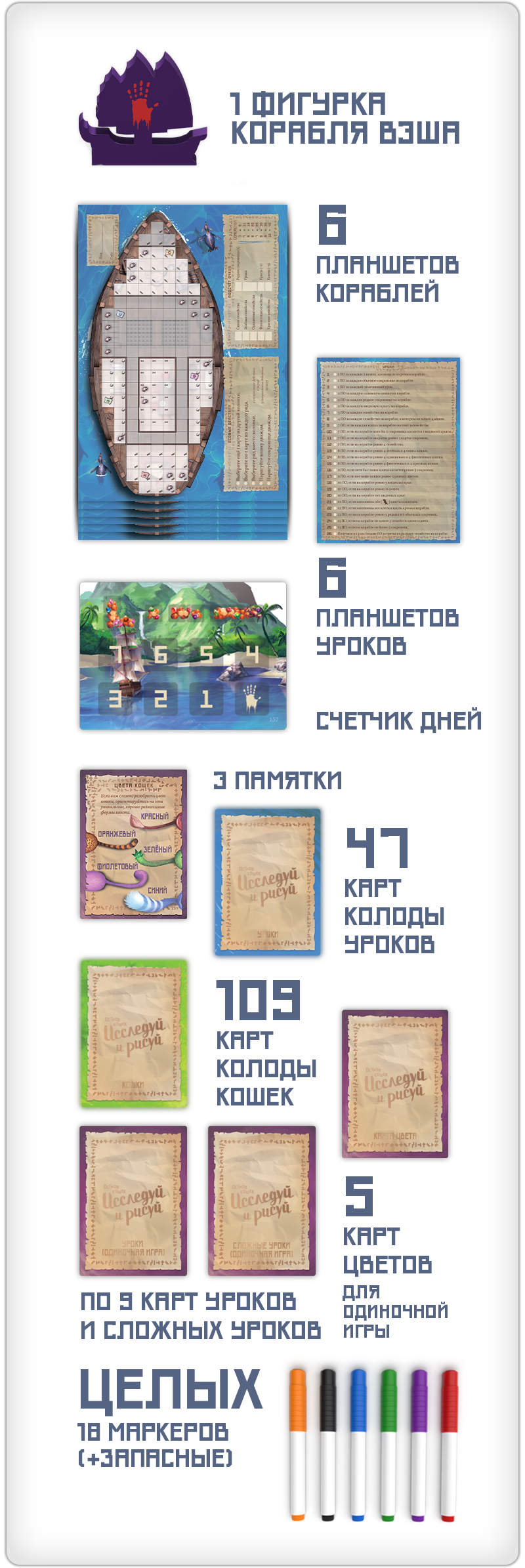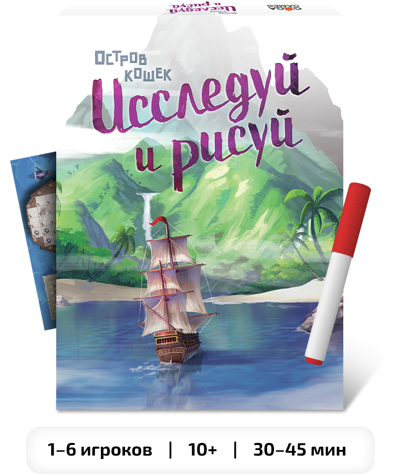 Партии в «Исследуй и рисуй» одновременно напоминают «Остров кошек» и категорически на него не похожи. Вместо рынка с жетонами котиков здесь — ряды карт, на части которых будут нарисованы коты и сокровища, а на других — написаны уроки. Но теперь задания, которые вы взяли, нужно будет отмечать маркером в списке, а котиков — зарисовывать прямо на планшете корабля. И никакого напряжённого подсчёта, хватит ли вам рыбы, — как и в семейном режиме, здесь эту механику убрали.