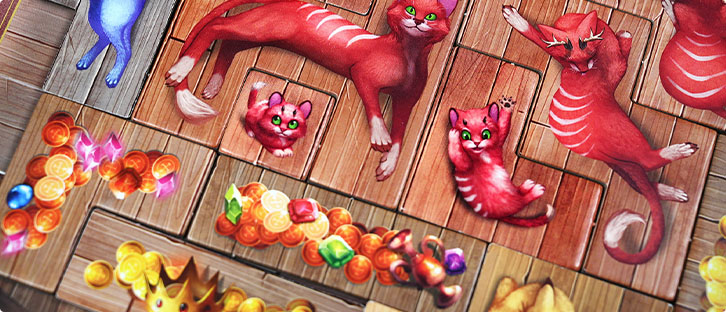 Котята — самый простой и понятный модуль. Как известно, котята — это маленькие кошки. А значит, в игре появляются жетоны котят! Они занимают от 1 до 3 клеток (для сравнения взрослые кошки никогда не бывают меньше 4), но поймать их не так уж просто. Юркие и пугливые, котята так и норовят спрятаться в зарослях, так что поймать их может только самый быстрый игрок — то есть тот, кто в текущем раунде ходит первым.