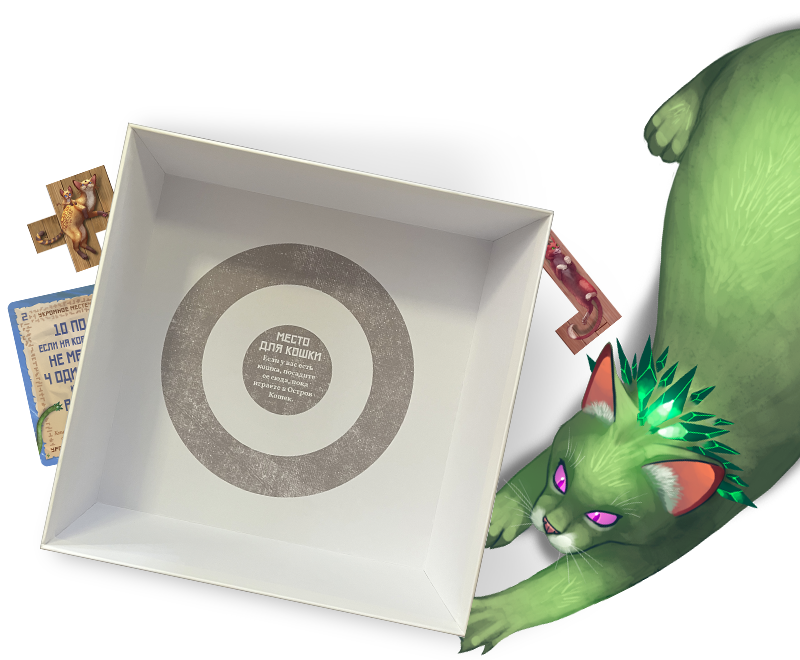 Бигбокс вмещает в себя «Остров кошек» со всеми дополнениями, включая промокарты и оба набора предзаказа. Карты в протекторах сюда тоже поместятся. А ещё хранить такую коробку можно как горизонтально, так и вертикально.