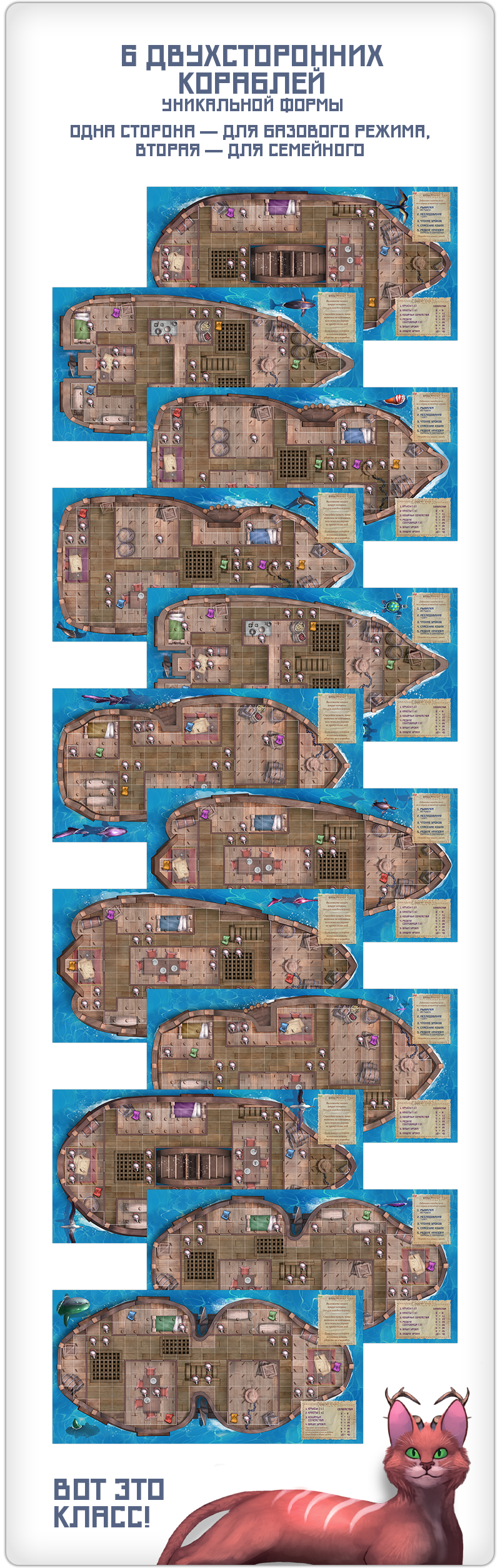 Дополнение с уникальными кораблями — чтобы добавить партиям ещё больше разнообразия! У каждого корабля своя уникальная форма и расстановка кают, так что к ним даже прилагаются памятки — чтобы вы точно не запутались, где капитанская каюта, а где столовая.