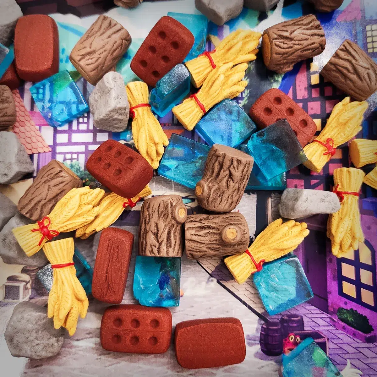 соответствующего ресурса и положить его на одну из клеток своего планшета. Ваша задача — собирать ресурсы в определённые фигуры, изображённые на картах зданий, выбранных на партию. Все фигуры можно поворачивать и отражать любым способом — главное, соблюдать структуру и не выходить за рамки планшета.